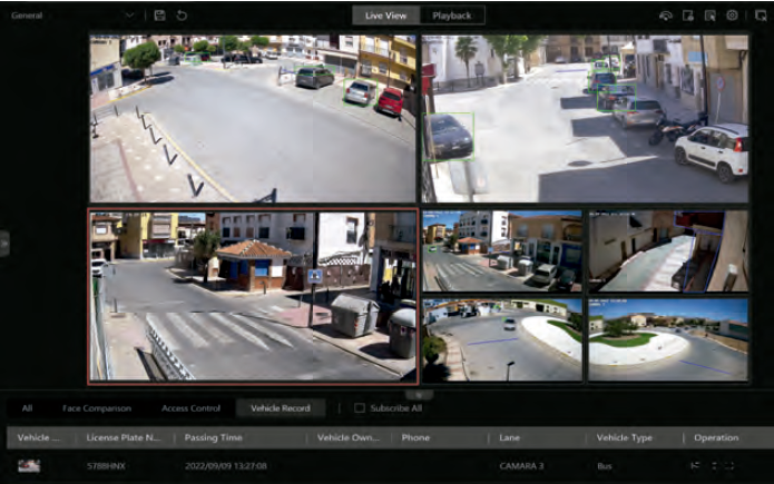 - Cada zona de vigilancia de tráfico está compuesta por un conjunto de una cámara panorámica 360º de alta resolución en color, para la grabación del entorno, y una o dos cámaras para la lectura de matrículas.